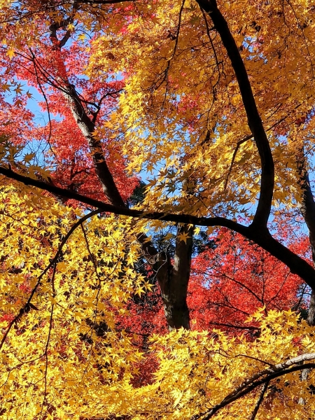 12月上旬の本土寺です。山門を潜ると頭上が華やかで、赤や黄色に紅葉したモミジが青空に映えて綺麗だったのでアップで撮りました。