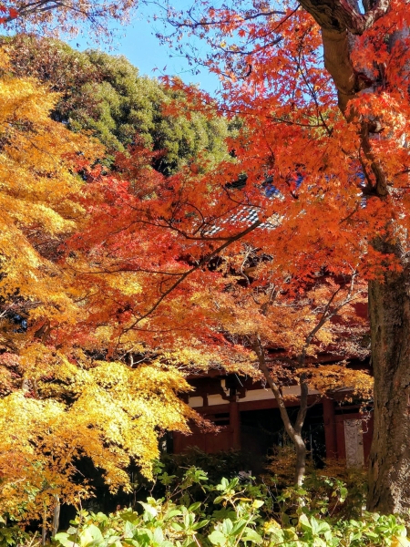 12月上旬の本土寺です。赤やオレンジ、そして黄色に紅葉したモミジと緑、そして青空のコントラストが綺麗でした。