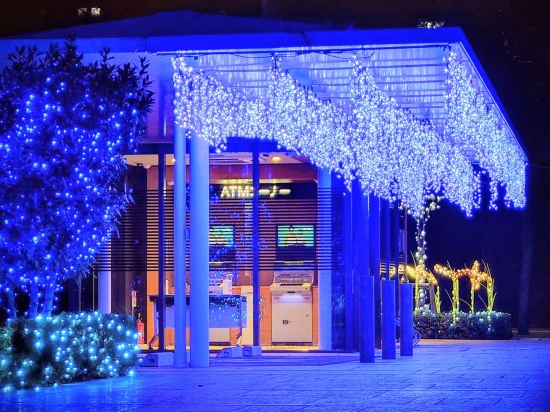 12月下旬の京葉銀行千葉みなと本部です。ATM前の藤棚のような青いイルミネーションが暗闇に浮かび上がり綺麗でした。