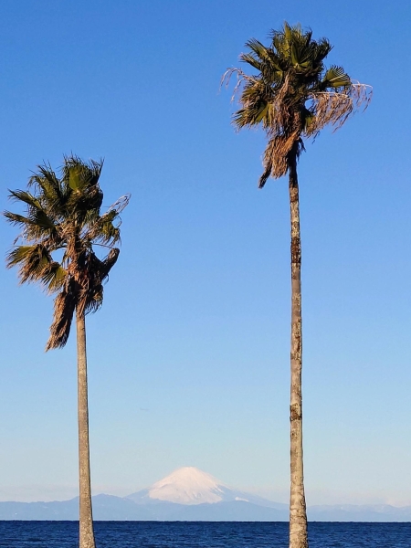 1月上旬の北条海岸です。背の高いヤシの木の先の富士山が、新春の青空に映えて綺麗でした。