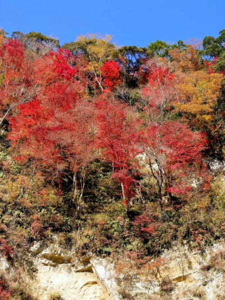 11月下旬の梅ヶ瀨渓谷です。赤やオレンジに紅葉したモミジと白壁、そして青空のコントラストが綺麗だったので、アップで撮りました。