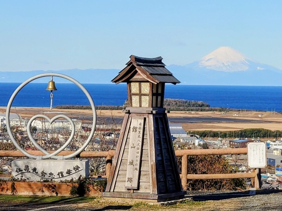 1月上旬の城山公園です。里見八犬伝の8つの文字のオブジェの先に、白い雪の富士山と青い海が見えて絶景でした!