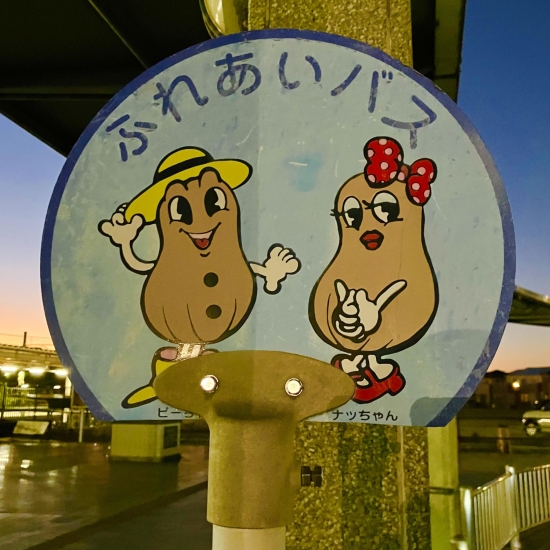 八街駅のバス乗り場にピーちゃんとナッちゃんがいたよ。 バスの待ち時間、すごく寒かったけれど、愛嬌のあるイラストを眺めていたら心がほんわか温まった。