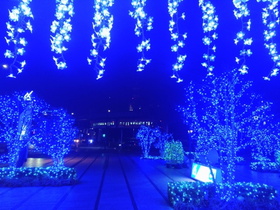 12月下旬の京葉銀行千葉みなと本部です。ATM前の藤棚のようなイルミネーションに照らされて一面青の世界でした。正面の灯りはモノレールです。