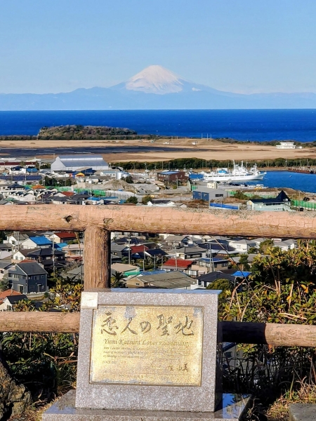 1月上旬の城山公園です。上りきった館山城の先に富士山が大きく見えたので、恋人の聖地のプレートを入れて一緒に撮りました。金のプレートが新春の青空と青い海に映えて綺麗でした。
