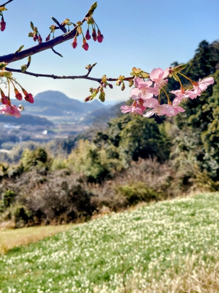 1月中旬の江月水仙ロードです。地蔵堂を少し上った江月山頂付近は一面の水仙と河津桜が青空に映えて綺麗でした。