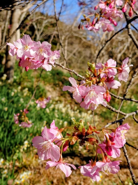 1月中旬の江月水仙ロードです。地蔵堂を少し上った江月山頂付近に河津桜と水仙が咲いていました。ピンクと黄色い花が綺麗でした。