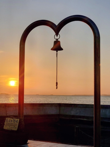 1月中旬の浜金谷です。恋人の聖地、幸せの鐘と夕日を一緒に撮りました。シルエットの鐘と夕日を浴びて輝く金のプレートが綺麗でした。