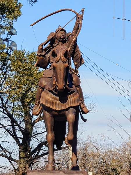 1月上旬の千葉城です。千葉常胤公の騎馬像を正面から撮りました。まるで馬が真っ直ぐ向かって来るような迫力があります。