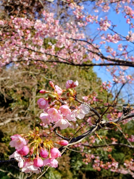 1月下旬のとみやま水仙遊歩道です。水仙を見に来ましたが、河津桜が咲いていました。濃いピンクの花が青空と緑に映えて綺麗でした。