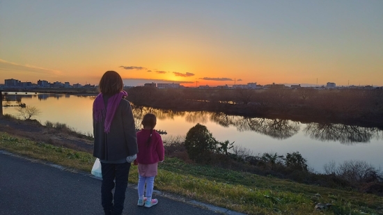 みりんミュージアムの帰り道、陽が沈む直前の河川敷に登ってみたら…穏やかな川の流れと夕焼けの絶景が広がっていて思わず親子で立ち尽くしたまま見惚れてしまいました。
