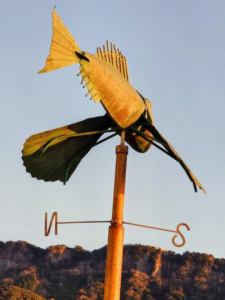 1月下旬の浜金谷です。ザ・フィッシュの海側に魚の形の風見鶏がありました!まるで夕陽を浴びて空を泳いでいるようです。バックは鋸山です。