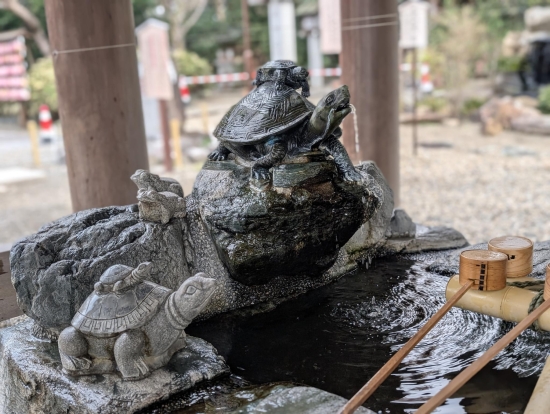 春の桜や桜のモチーフ等が綺麗で可愛らしいですが、手水舎の亀と蛙も可愛らしいですよ
