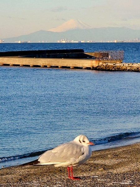 1月下旬、早朝の検見川の浜です。富士山を眺めていたら、ゆりかもめ?が降りて来ました。ゆりかもめ?をメインにして、青い海と白い富士山をバックに一緒に撮りました。