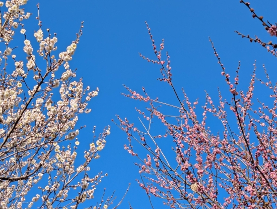 青空にちょうど紅白の梅が並んで咲いていました。満開。