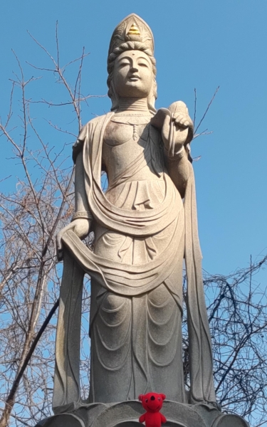 布施弁天に行って来ました。観音様とちーばくんのツーショットです。赤いちーばくんのワンポイントが目を引きます。
