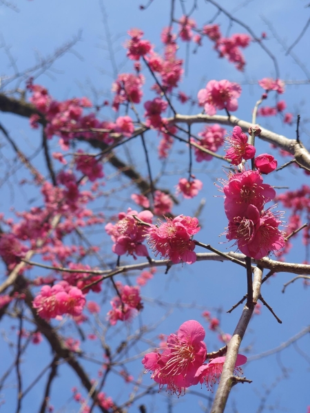 1月下旬のとみやま水仙遊歩道です。水仙を見に来ましたが、梅が咲いていました。濃いピンクの花と青空のコントラストが綺麗でした。