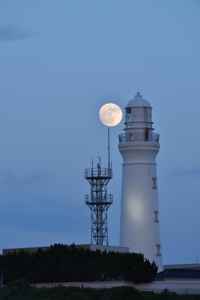 暮れなずむ空に満月、何やら犬吠埼灯台と明るさを競っているように見えました。