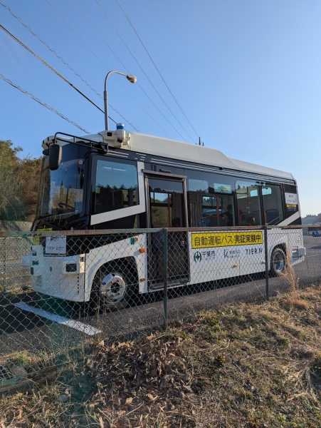 近くで自動運転バスの実証実験をしています。初めて目にしました。カメラの数がとっても多いですね。未来型!楽しみ!