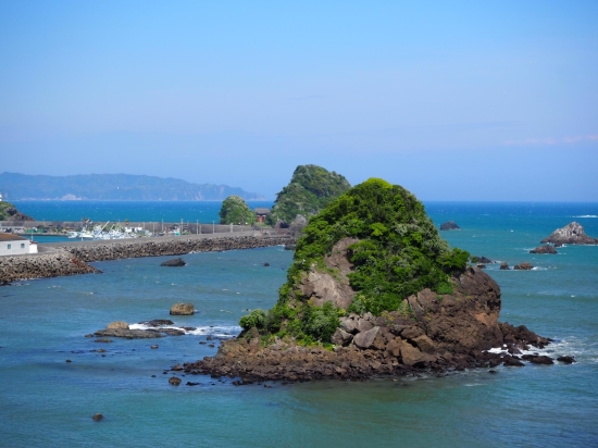 島に茂った緑色の木々とたいへん美しい青色の海のコントラストが素晴らしい。