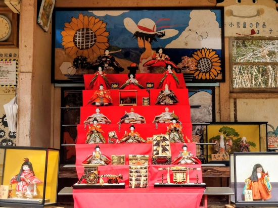 2月下旬の上総大久保駅です。無人の小さな駅舎にも雛飾りが置かれていました。雛飾りとひまわりの絵の季節の違う珍しいショットです。