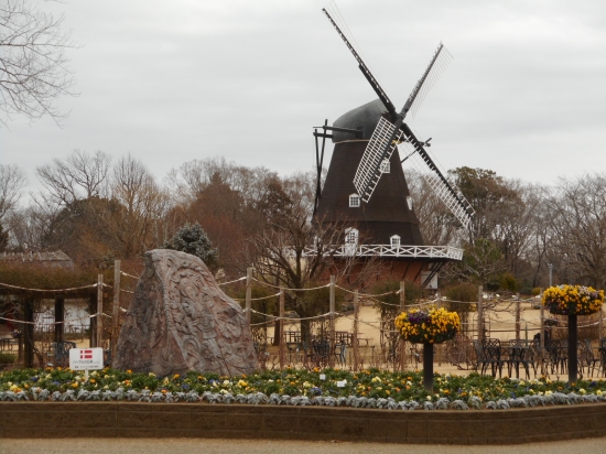 寒い冬の日にまるで春のように咲き誇るアイスチューリツプと風車