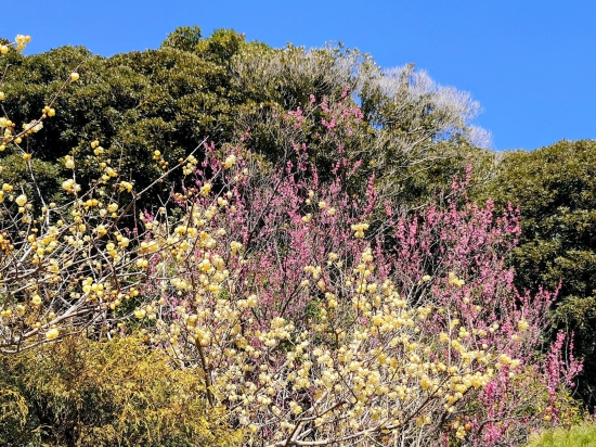 1月下旬の石井蝋梅園です。沢山の黄色いロウバイと紅梅が、緑の森と青空に映えて綺麗でした。春らしい写真が撮れました。