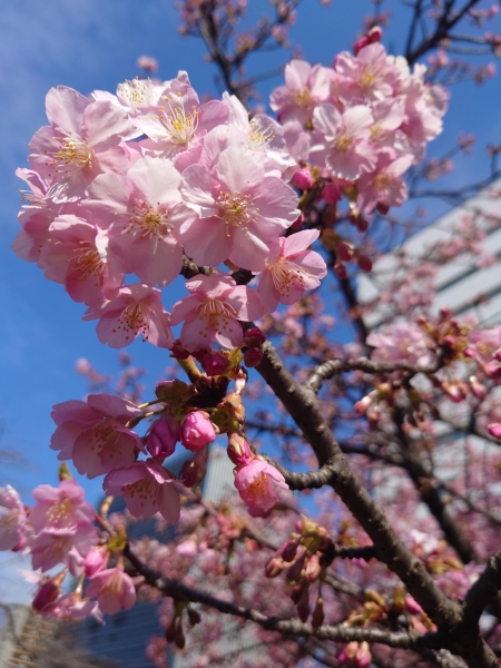 2月下旬のみなと公園です。ピンクの河津桜が青空に映えて綺麗だったのでアップで撮りました。後ろの建物は千葉市役所と千葉銀行本店です。