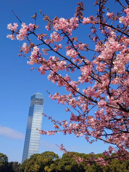 2月中旬の千葉ポートタワーです。野外ステージ脇の河津桜が青空に映えて綺麗でした。濃いピンクの花とポートタワーの春らしいツーショットです。