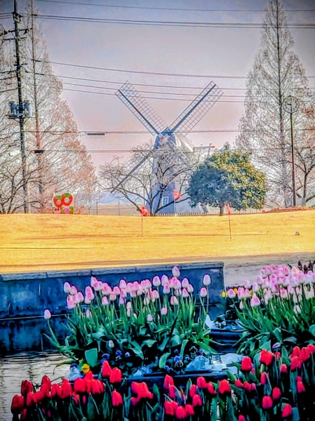 2月中旬のあけぼの山農業公園です。ひょうたん池に浮いた花いかだのチューリップが綺麗だったので、風車とのツーショットを撮りました。