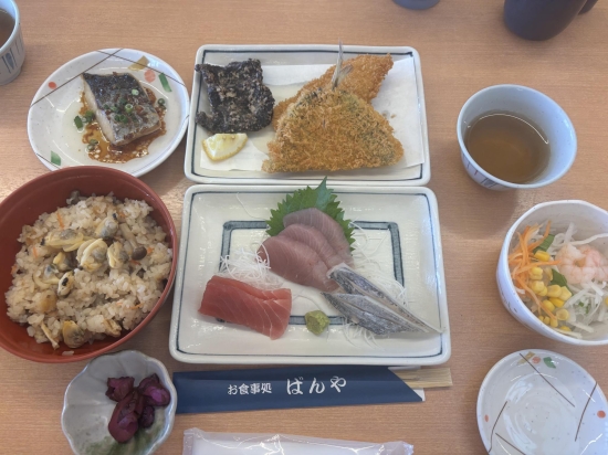 2025年11月、漁港の食事処ばんや三で。朝獲れの魚介類をふんだんに取り入れたボリューミーな漁師料理を堪能しました。