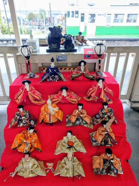 3月上旬の上総牛久駅です。駅舎の改札の前に雛人形が飾られていました。3番線に白と緑のキハ40東北色が停車していたので、雛人形と一緒に撮りました。