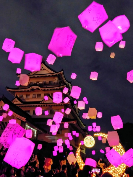 3月下旬の千葉城です。千葉市が千葉開府900年記念イベントとしてランタンの打ち上げを行いました。夜空にピンクのランタンが打ち上がりお城に映えて幻想的でした。