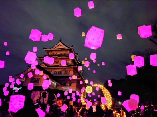 3月下旬の千葉城です。千葉市が千葉開府900年記念イベントとしてランタンの打ち上げを行いました。夜空に沢山のピンクのランタンが打ち上がりお城に映えて幻想的でした。