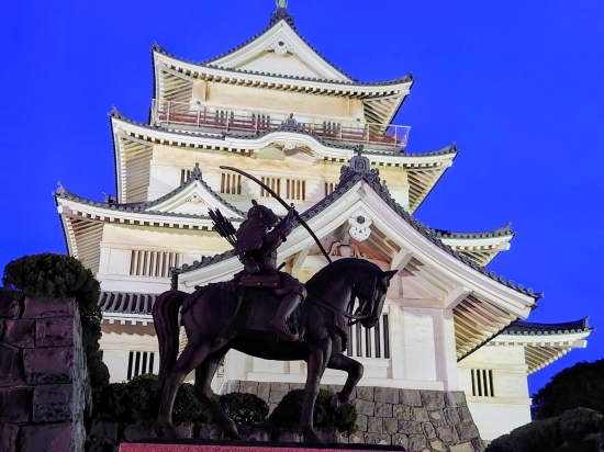 3月下旬の千葉城です。千葉常胤公の騎馬像と白くライトアップされた千葉城が、青い夕空に映えて綺麗でした。