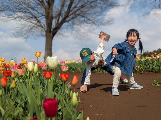 春の訪れ、友人とコビト図鑑のイベントでコビトを探しに、お花も咲き乱れて美しい景色に子供達もるんるん♪ チューリップの様に元気いっぱい!!