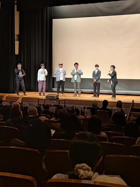 松戸ムービーフェスティバルのトークショーで温泉シャークの井上監督とその仲間たちの写真です