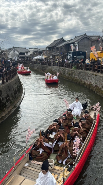 春のひな祭り、雛壇に合わせた7そうの雛船が、雅楽の音色にのって進みます。