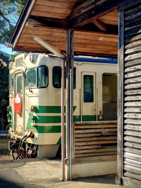 木造の上総中野駅舎と小湊鉄道キハ40のツーショットは、昭和レトロな感じがします♡