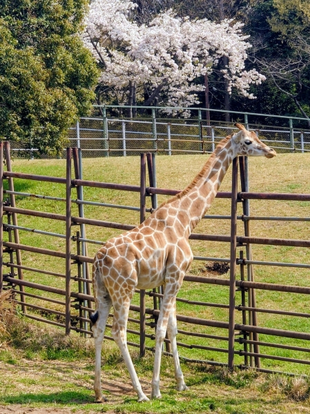 3月下旬の千葉市動物公園です。園内を歩いていると、キリンさんがいました!貴重なキリンさんと桜のツーショットです。キリンさんも桜を見ているのでしょうか?