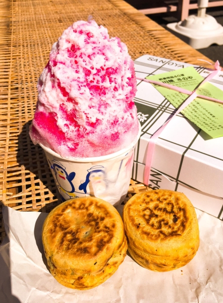 お買物された方に、焼きたてぬれ煎餅又はぬれおかき1枚プレゼント