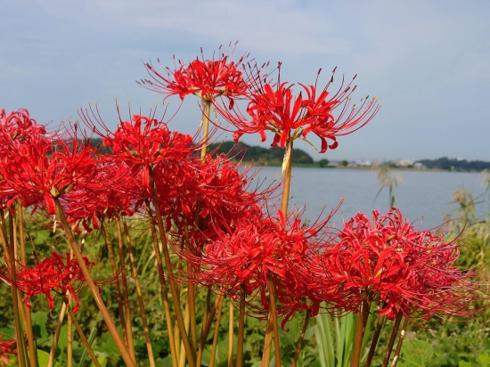 10月上旬、サージタンク広場前の手賀沼自然ふれあい緑道です。赤い彼岸花と水辺の手賀沼の珍しいツーショットが捕れました!