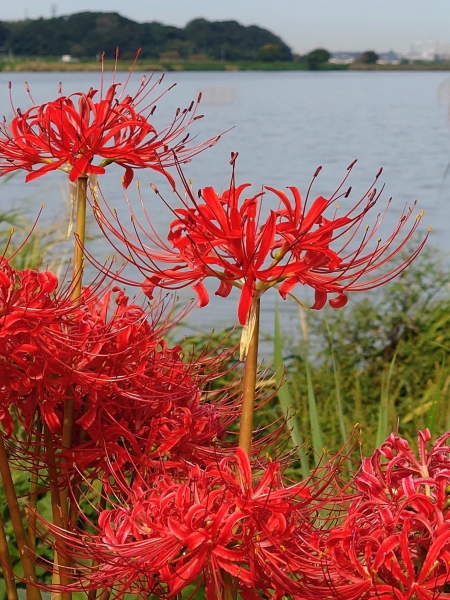 10月上旬、サージタンク広場前の手賀沼自然ふれあい緑道の彼岸花です。赤い花と手賀沼のツーショットを青い水辺を多く入れて一緒に撮りました。