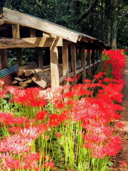 9月下旬の熊野神社です。午後の日射しを浴びて光り輝く赤い彼岸花と緑の茎が綺麗でした。