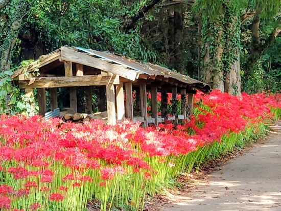 9月下旬の熊野神社です。午後の日射しを浴びた赤い彼岸花と緑の森のコントラストが綺麗でした。