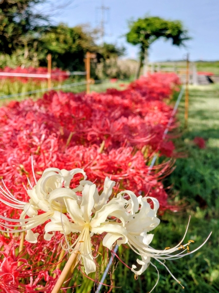 10月上旬の手賀沼あけぼの橋広場です。赤い彼岸花の中に白い彼岸花が咲いていたので、一緒に撮りました。赤と白の花が青空に映えて綺麗でした。