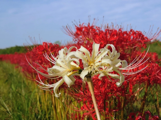 10月上旬の手賀沼ふれあい緑道です。赤い彼岸花の中に白い彼岸花が咲いていたので、一緒に撮りました。赤と白の花が青空と緑に映えて綺麗でした。