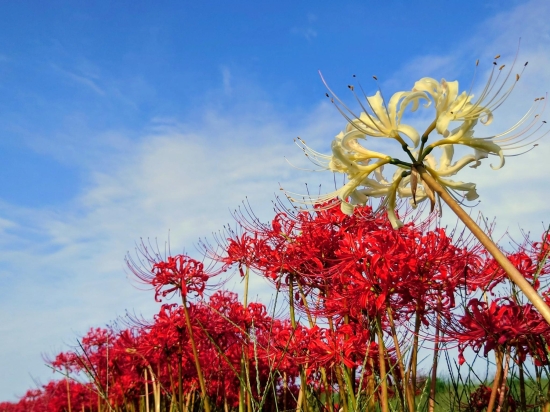 10月上旬の手賀沼自然ふれあい緑道です。赤い彼岸花の中に白い彼岸花が咲いていたので一緒に撮りました。赤と白の花が青空と白い雲に映えて綺麗でした。