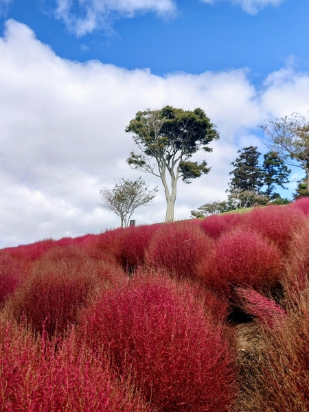 10月中旬のマザー牧場です。花の大斜面東のコキアの紅葉が見事でした。赤いコキアが青空と白い雲に映えます。