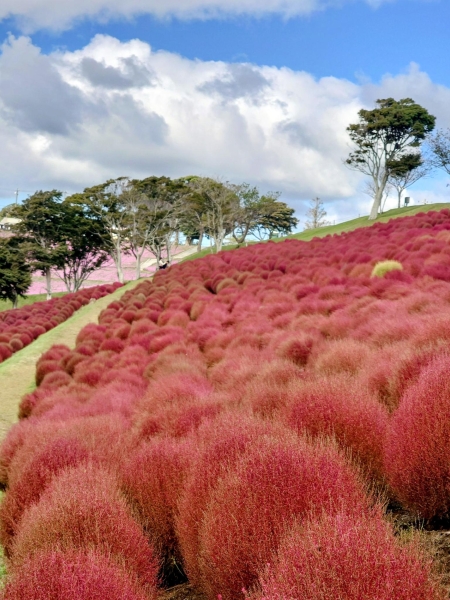 10月中旬のマザー牧場です。花の大斜面東のコキアが赤く紅葉して綺麗でした。奥の花の谷にはピンクのペチュニアも確認出来ます。